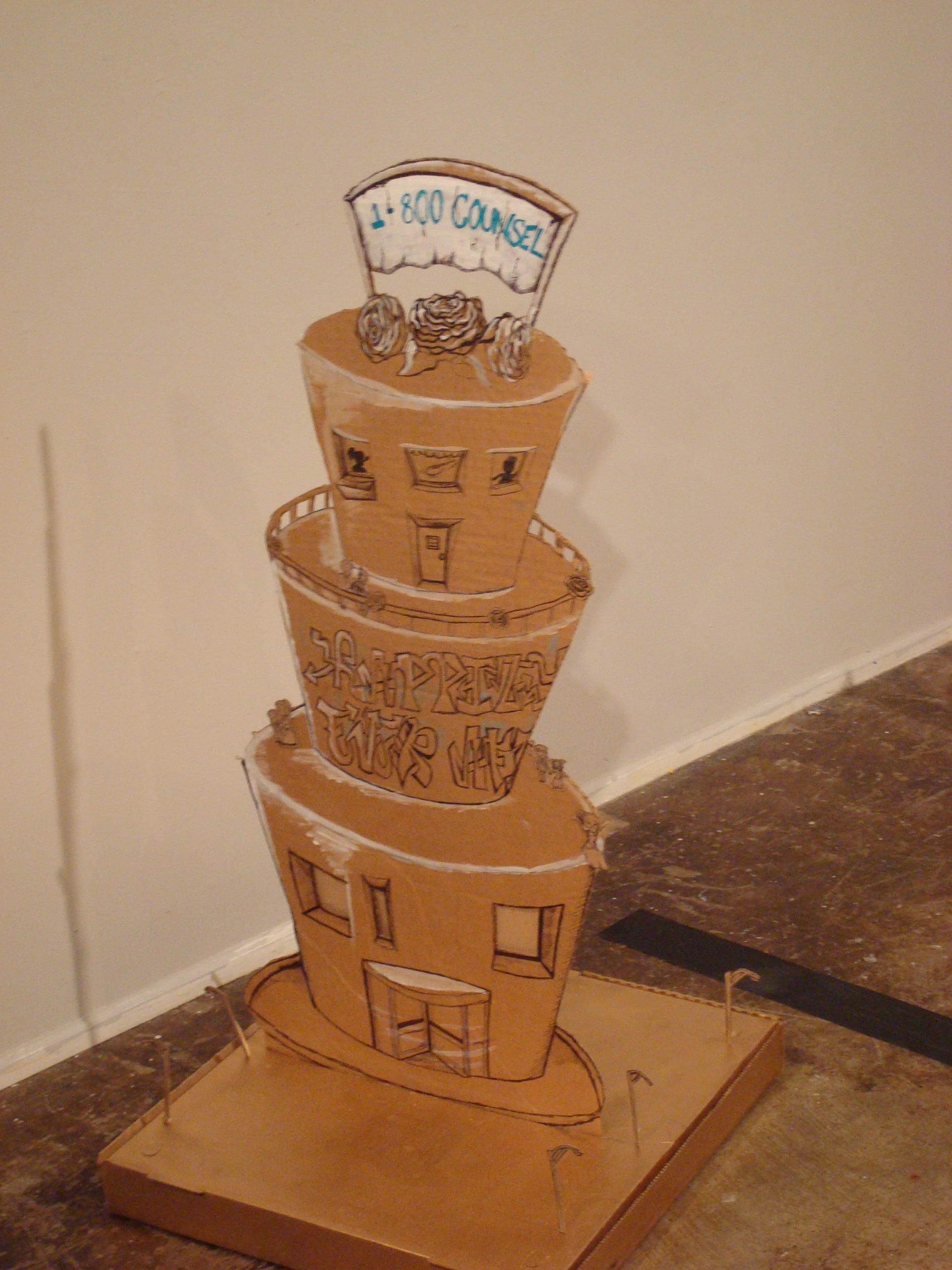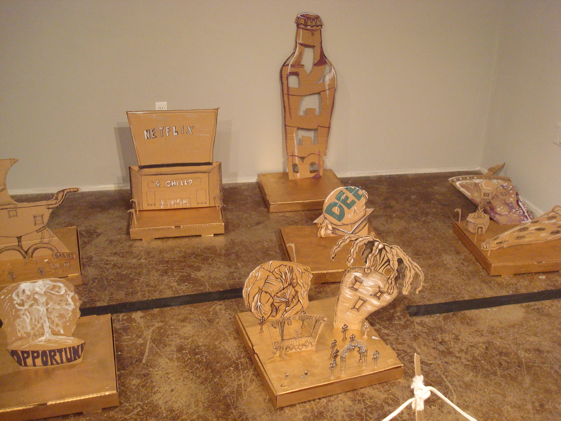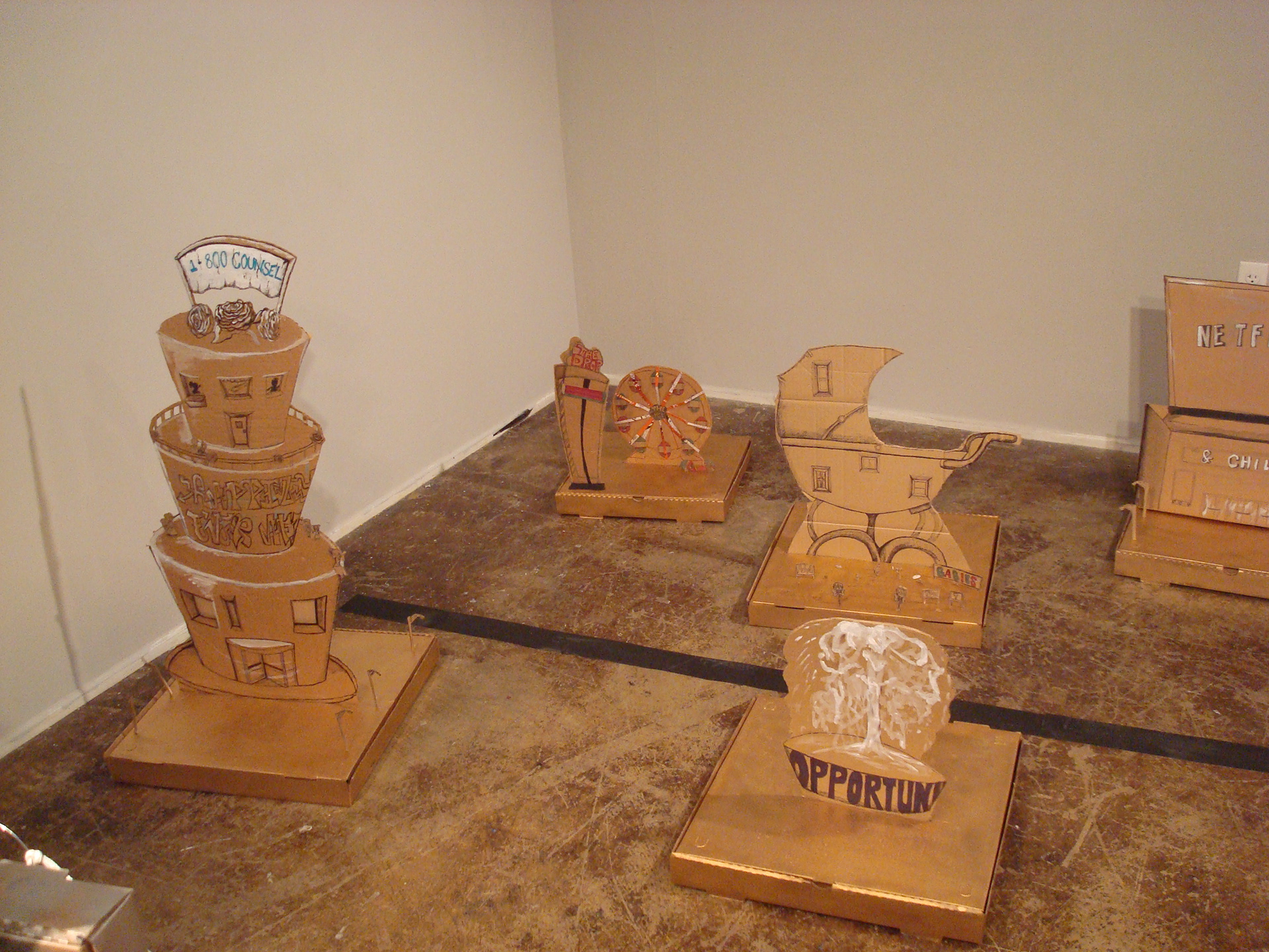 The "City of Great Expectations" represents a perspective look on the realities and expectations a young adult encounters when entering the working world. Students preach their idealistic view of the world as they work towards the completion of their secondary education. This idealism, represented by simple storybook illustrations and gold painted city blocks, show four different topics an individual encounters on their everyday trek: relationships, vices and lifestyle decisions, education as a whole, and other social concerns.